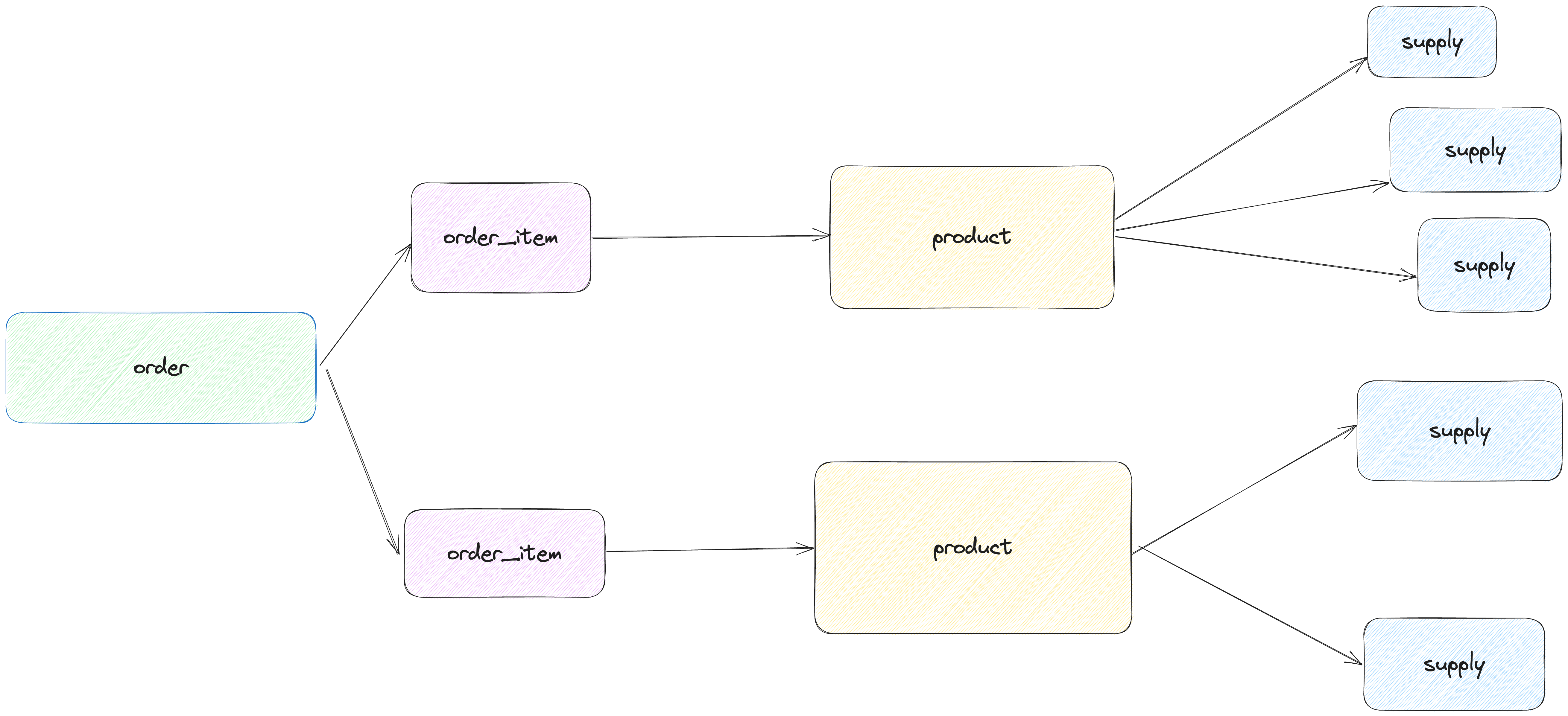 Now, let's tackle a thornier situation. Products and supplies both have dimensions and measures but no time dimension. Products has a one-to-one relationship with order_items, enriching that table, which is itself just a mapping table of products to orders. Additionally, products have a one-to-many relationship with supplies. The high-level ERD looks like the diagram below.
